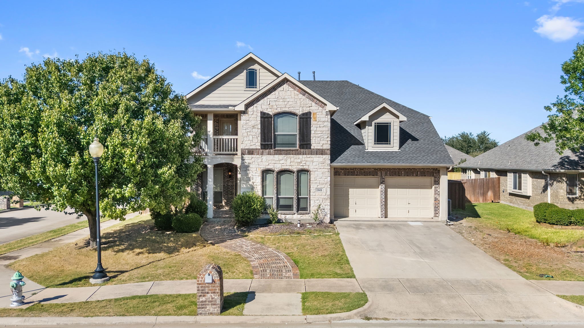 Back on the market and offering an assumable 4.75% interest rate, this exceptional home presents a rare opportunity to own a spacious, beautifully designed property in one of North Texas's most desirable areas. The open and expansive layout offers two primary suites--one on the main floor featuring a private bath with a soaking tub and separate shower, and another upstairs with its own balcony, perfect for relaxing evenings or morning coffee. With three inviting living areas, including a cozy great room with a fireplace, a comfortable main living room, and an upstairs loft that opens to a second balcony, there's plenty of space for both entertaining and everyday living. The large kitchen serves as the heart of the home, featuring a generous bar area, tile flooring, and ample room for meal prep or gatherings. Rich hardwood floors flow throughout the main level, adding warmth and elegance to the great room, living areas, and hallways. The home includes four full bathrooms, a spacious backyard patio ideal for outdoor entertaining, and sits proudly on a corner lot with a front-facing double garage. Additional upgrades include two brand-new HVAC systems, ensuring comfort year-round. Perfectly located just minutes from the new PGA Headquarters, Universal Kids Resort, The Star by Jerry Jones, Lake Lewisville, Legacy West, and premier shopping and dining, this home combines luxury, location, and lifestyle. With excellent schools nearby and a true family-friendly atmosphere, this property delivers comfort, convenience, and lasting value. The seller is motivated--don't miss this incredible opportunity to make it yours!